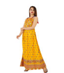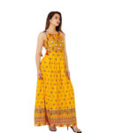 Comfortable Long Dress Jaipuri Printed in Rayon Fabric For Parties, Festivals and for wedding occasions even works fabulous in Clubs parties.